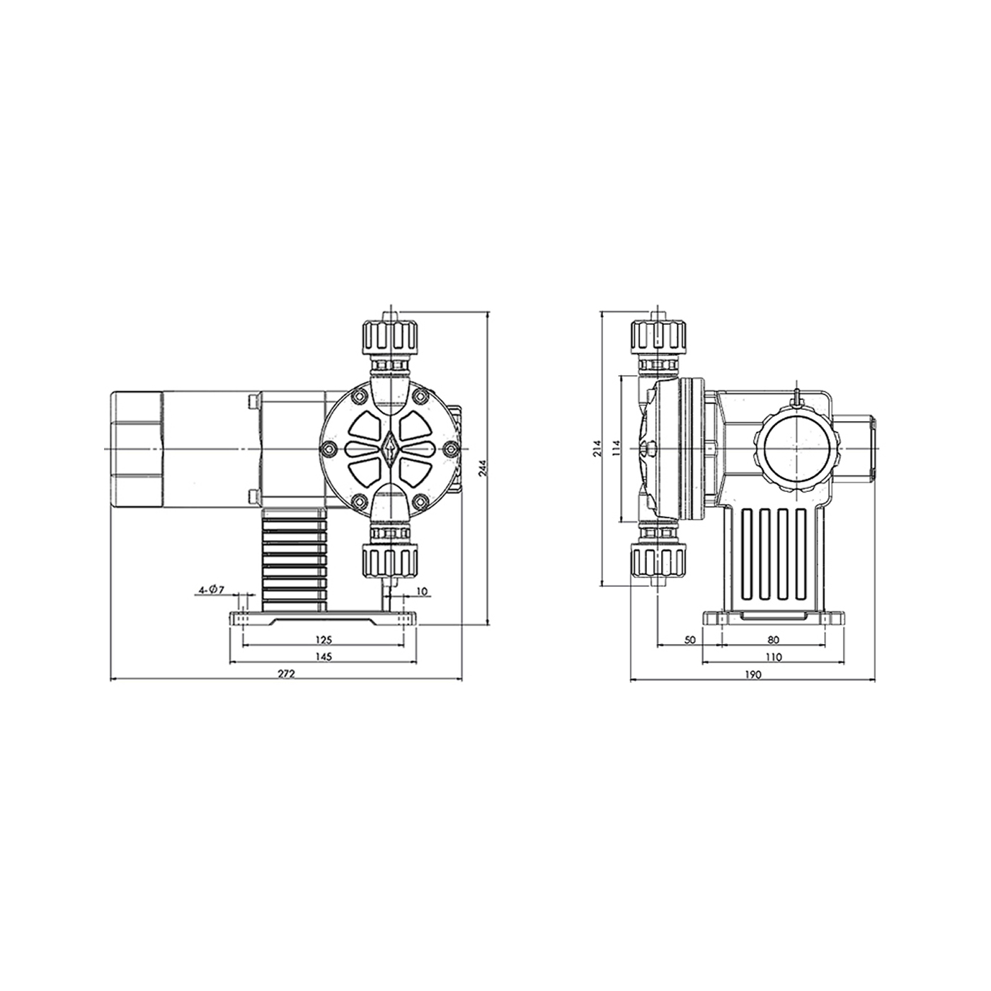 Производительность насоса составляет 15–150 л/ч при максимальном давлении до 8 Бар. Регулировка расхода осуществляется вручную маховиком, в диапазоне 0–100%, независимо от того, работает насос или нет. В пределах 30–100% точность дозирования составляет ±1%. При необходимости насос комплектуется взрывозащищенным или частотно-регулируемым двигателем